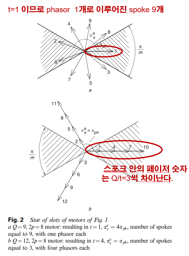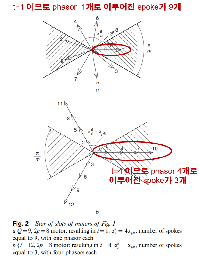 α_s에 자석의 극쌍 수 만큼을 곱해준 것이다. α_ph는 스포크 간의 전기각 거리로 전기각 1회전(= 2π)을 스포크 개수 Q/t 로 나눠준 값이다.