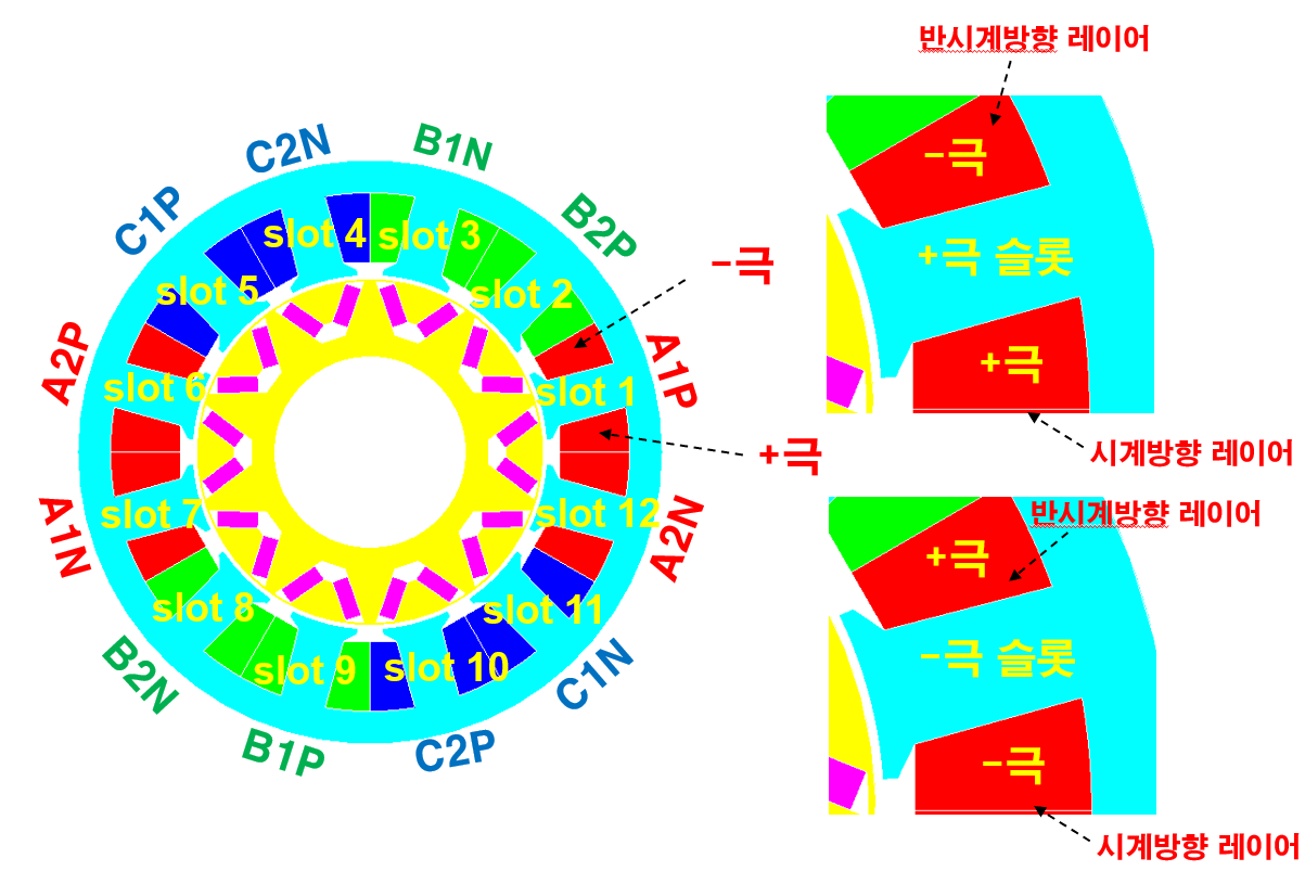 슬롯의 시계방향 레이어가 P로 설정되고, 반시계방향 레이어가 N으로 설정되면 그 슬롯엔 P극 권선이 감겨진 것이다.