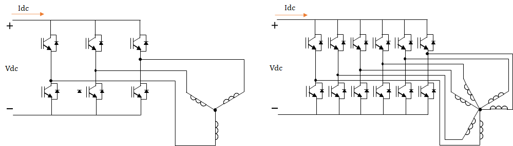 위 회로도를 보자. 왼쪽이 3상이고 오른쪽이 6상의 경우다. 인버터의 다리(Leg)가 2배로 늘었다. 즉 병렬로 연결된 브랜치가 2배가 되었음을 알 수 있다. 전체 소모되는 전력이 3상과 6상이 동일하게 3kW라면 입력에서 들어가는 전력도 3kW일 것이다(효율은 100%라고 치자). 그러면 Vdc와 Idc의 곱이 3kW일 것이고 오른쪽 6상의 Idc는 6개의 다리로 나눠져 들어간다. 3상에서는 3개의 다리로 나눠져 들어갔는데 말이다. 즉 2배로 더 많이 전류를 쪼개서 가져간다는 뜻이다.