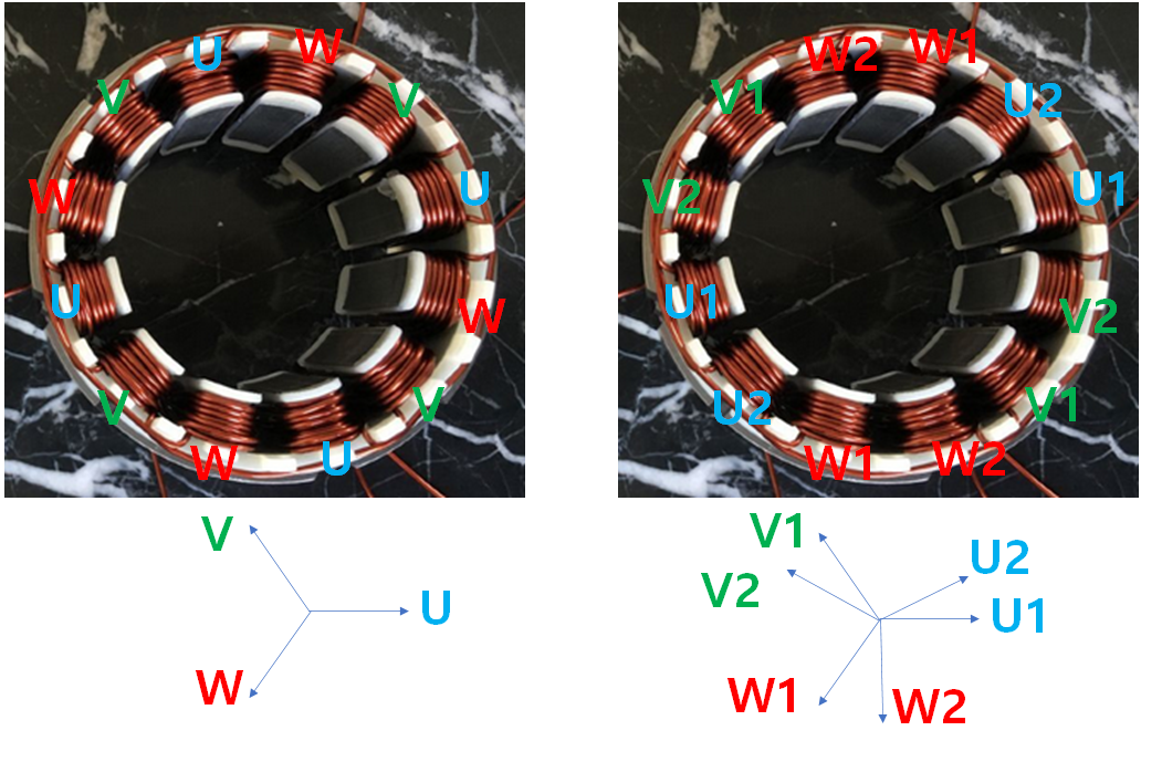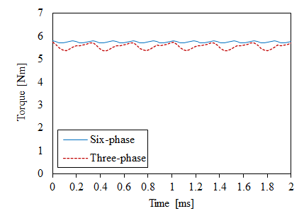 그런데, 6상은 2개의 3상 권선으로 이루어져있다. 그러니 만약에 어느 한상이 고장나면, 그 상을 포함하는 3상 권선 세트를 통째로 차단해버리고 나머지 평형 3상으로 구동하면 그래프처럼 토크 맥동이 적은 3상 구동이 가능하다. 당연히 최대 출력은 절반으로 줄테지만..... 그래도 전기차나 도시철도처럼 고장나면 다른 차량들의 운행에도 영향을 주는 곳에서는 일단은 계속 운전해서 휴게소나 역 등의 정비할 수 있는 곳으로 갈 수 있다는 점이 큰 장점이 될 수도 있겠다.