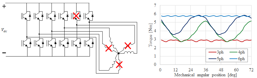 보통 3상 모터는 한창 돌고 있는 와중에 한 상에서 쇼트, 합선이 나거나 전선이 끊기거나 해서 고장이 나면 더이상 토크를 만들어내지 못하고 멈춘다. 하지만 5상 이상에서는 한 상에서 고장이 나더라도 나머지 4상으로 어떻게든 돌릴 수는 있다. 단지, 공간적으로 발생되는 자기장의 간격이 불평형해지니 토크 맥동이 엄청나게 커지게 된다. 오른쪽 그래프는 6상에서의 구동하는 상 수에 따른 토크 곡선이다. 1상이 고장난 5상 운전과 2상이 고장난 4상 운전은 토크 맥동이 엄청 커진다.