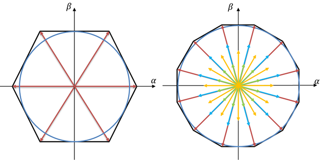 공간벡터 변조법(Space Vector PWM: SVPWM)을 아신다는 가정하에 설명을 드리겠습니다. 왼쪽의 3상 인버터의 공간벡터도는 6각형이지만, 오른쪽의 6상 인버터의 공간벡터도는 12각형입니다. 간단히만 봐도 내접원이 더 커지게 되고 따라서 선형변조영역이 더 넓어지게 됩니다.
