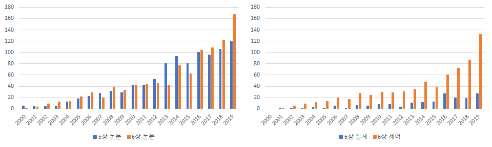 위 그래프는 IEEExplore를 통해서 조사한 최근 논문 게재의 추이이다. 최근에는 전기자동차와 철도에 쓰일 추진용 모터의 연구개발이 활발하게 이뤄지고 있기 때문에, 5상과 6상 모터의 제어와 설계에 대한 논문 수가 꾸준히 늘고 있다. 특히, 좀 더 높은 안정성을 보장하는 6상 모터의 연구가 2018년과 2019년 사이에 급격히 늘어났다.