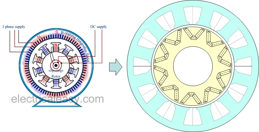 왼쪽의 권선형 동기전동기는 회전자에 권선을 감고 DC전류를 흘려서 회전자 자기장을 만들어냅니다.