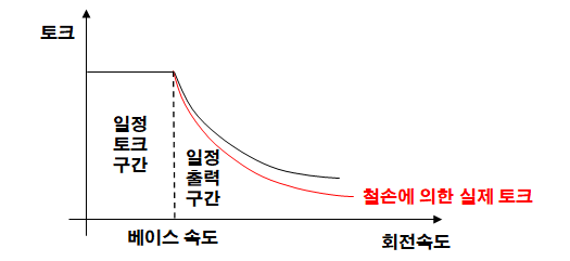 철손이 속도의 증가에 따라 점점 증가하면서 이상적인 경우보다 더 가파르게 출력토크의 감소가 생깁니다.