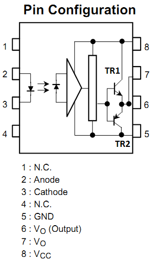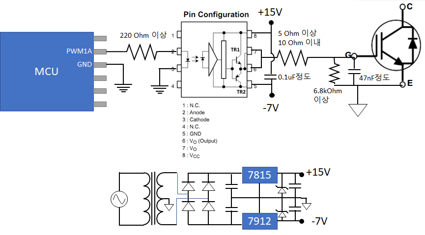 2번과 3번이 입력측이고, 5678번 핀이 출력측인데, 6번과 7번은 순간적으로는 꽤 큰 전류가 흐르기도 하니 푸시풀 출력을 2개의 핀으로 나눠 놓았다. 8번에는 턴온전압을 연결하고, 5번에는 턴오프 전압을 연결해주면 된다. 이때, 턴온전압과 턴오프 전압은 전기적 Isolation이 된 전압이어야 한다.