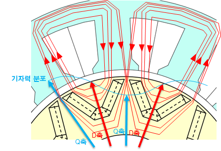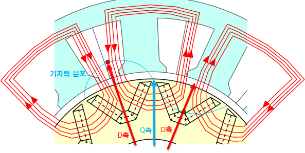 당연히 자속의 양도 기자력 분포에 비례해서 D축에 가까울 수록 자속의 양이 많고 Q축으로 갈수록 자속의 양이 줄어듭니다. 그렇게 분포된 자속 분포 값을 쇄교자속으로 계산하고 쇄교자속 인덕턴스를 계산하고, 누설자속 인덕턴스를 더하면 D축 인덕턴스가 됩니다. 자세한 이론과 수식은 다음 기회에 작성하거나 논문을 참조해주시기 바랍니다.