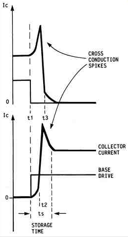 위쪽 파형에서 Q1의 스위칭 파형은 t1에서 스위치의 턴오프가 시작되었다. 똑같이 시간 t1에서 아래쪽 파형의 Q2는 스위치의 턴온이 시작되었다. 하지만 필연적인 Q1의 storage time 때문에, Q1의 콜렉터 전류는 t3를 지난 이후 때까지 차단되지 않는다. 동시에 아래쪽 스위치인 Q2는 턴온되기 시작한다. 전력 스위치에서 턴온 딜레이 시간은 일반적으로 storage time보다 짧다. 따라서 100% 듀티비에선 t2와 t3 사이의 짧은 기간동안 양쪽 스위치가 모두 턴온되는 시간이 존재한다.