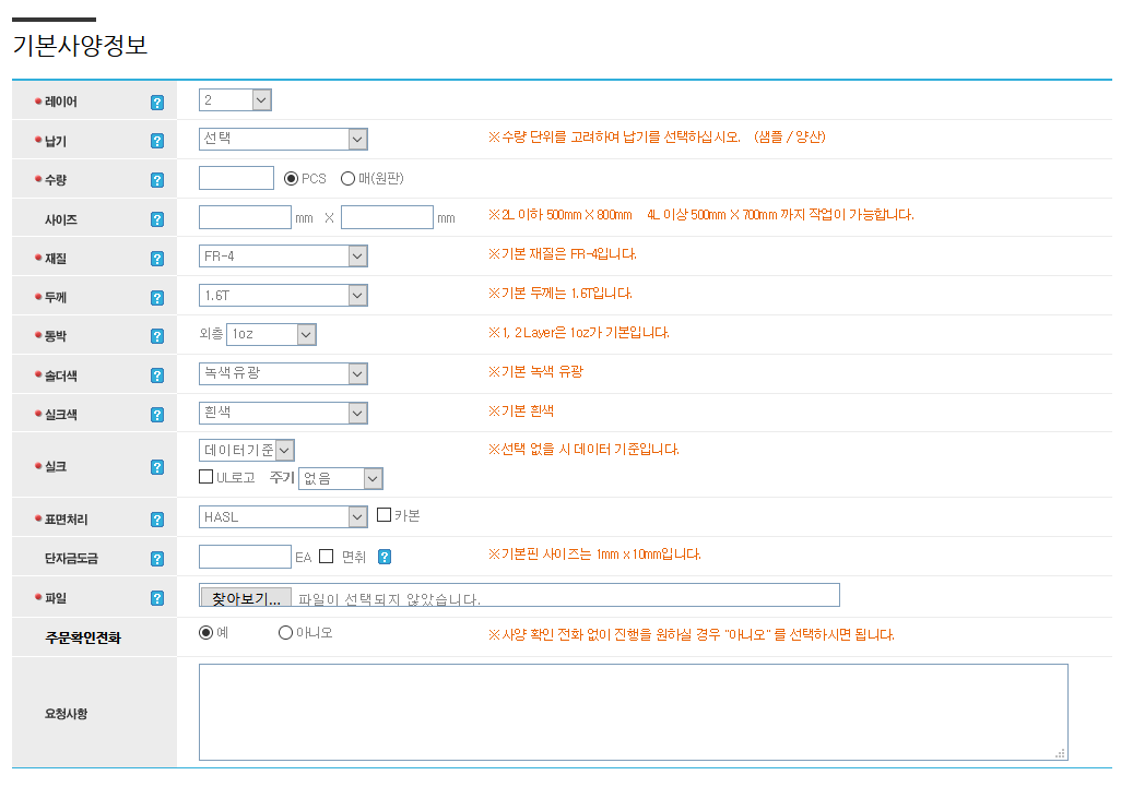 PCB를 처음 주문하는 초보자 입장에서는 생각보다 작성할 것이 너무 많아보입니다.