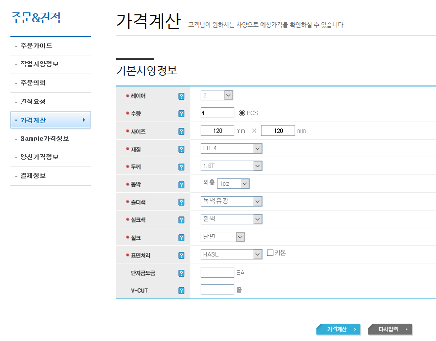 주문&견적의 가격계산 탭에서 기본사양정보만 입력하면 제작배송기간 별로 견적이 나옵니다.