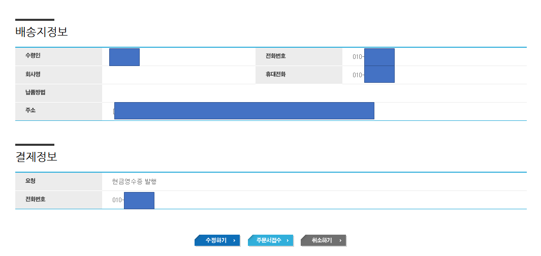 마지막 화면에서 주문정보를 확인하고 접수버튼을 누르면 됩니다.