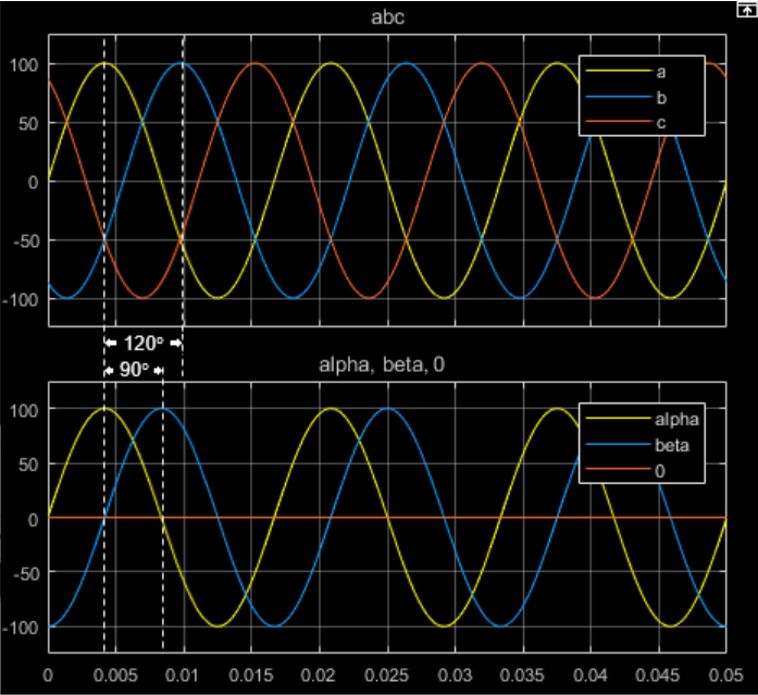 첫 단계는 '120도 간격의 위상차를 가지는 abc상'을 '90도 간격의 Alpha, Beta상'으로 바꿔주는 Clarke 변환.